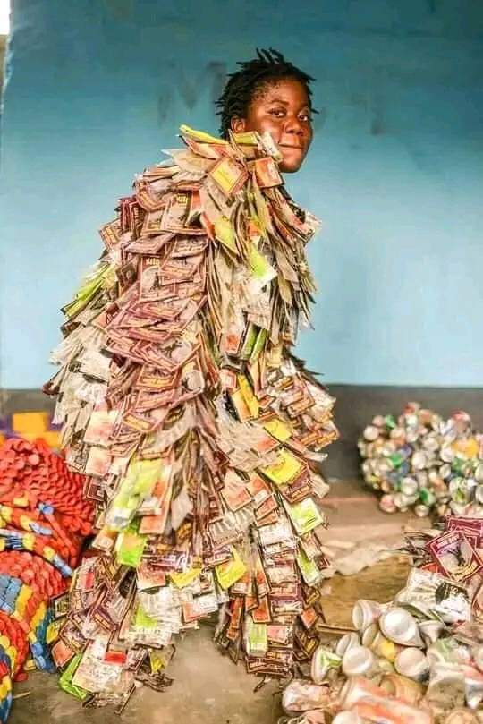 I'm the artist Nanou Longa. In my work, I ask myself how art can raise awareness of the danger of polluting the environment and the spirit of my people, whose new generations seem to be mortgaged by abusive and murderous alcoholism. My research and creations are based on the creation of costumes from the waste products of various alcohols, sold at low prices, but which destroy and sustain through writing.